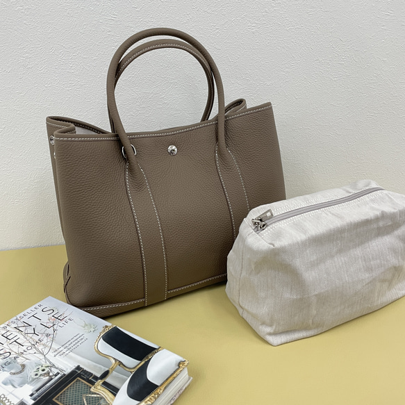 人気カラーのブラウングレーが販売です 安心感ある人気の牛革製トートバッグに以前大変好評いただきましたLサイズが数量限定で復活です。 物を出し入れしやすいシンプルなデザインで扱いやすさは抜群です。通勤や通学などのスタイルにもぴったり! もちろん!普段使いにも大人カジュアルにお使いいただけます。 荷物の多い方にも嬉しい収納力。 軽い一泊くらいならいけそうです(^^) 丈夫で高級感ある牛革素材を使用しています☆ 内側大きめのファスナーポケット付き 内側の生地と同素材のファスナー付きポーチもお付けします。 ※こちらのLサイズはショルダー無しです※ 【サイズ】 W35(ボタンを外して横長の時46センチ) ×H26×D17 センチ ハンドル高さ 15センチ 【重量】バッグ本体 約950g 【付属品】布製ポーチ 【本体価格】¥17,000-+tax ※チャームは別売りです