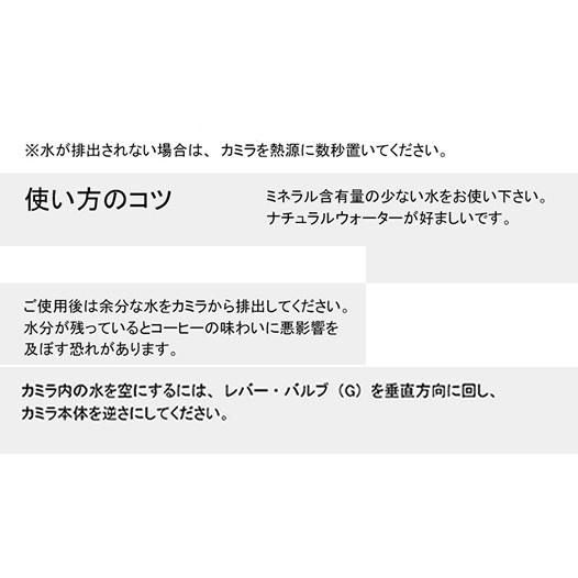 商品情報 ・サイズ:W14×D14×H21cm ウォータータンク容量 ・1カップ用(半分):30ml ・2カップ用(満水):60ml ポルタフィルターに入る粉の量 ・1カップ用:7グラム ・2カップ用:12グラム ・重さ:約1kg ・素材: ステンレススチール パッキン:シリコン ・製造国:イタリア ・付属品: 1カップポルタフィルター 2カップポルタフィルター 【ご注意】 ※kamiraは圧力器具です。お子様によるご使用はしないでください。 ※詳しくは同梱の取扱説明書をご参照ください。 ※カミラは職人による手作業のため「個体差」があります。 |