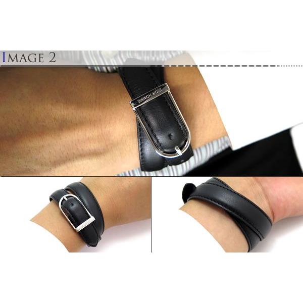 黒い革とベルトのバックルのような細い銀色の留め具の対比が美しいディオールオムのブレスレット。裏面にロゴが銀色で印字されています。※アウト