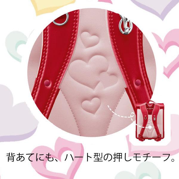 サイドには、大きなハートの中に小さなハートとお花をあしらったカワイイ刺しゅうでキュートさを演出。カブセにはエッチング加工で立体的に仕上げたハート型の鋲(びょう
