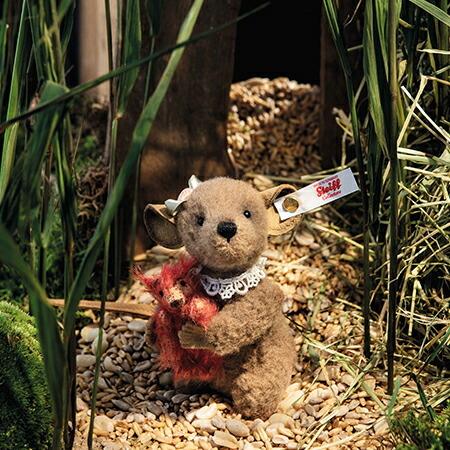 ネズミがお気に入りのシュタイフベアを抱えているシリーズの3作目となるクセニヤマウス。ウールプラッシュで、首にお花模様のレースの襟巻きをつけています。小さなクセニアマウスを見て