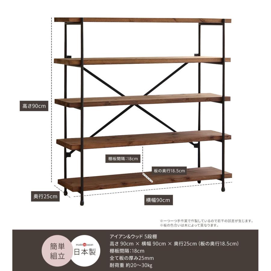 商品情報 自由な使い方が出来るオープンスタイルで、見せる収納を楽しめるアイアンラック。 木目がはっきりとしたヴィンテージな風合いを感じるカラー。 コントラストの効いた落ち着いた配色でシックな空間を演出します。 ヴィンテージスタイルやメンズライクなテイストはもちろん、シンプルなモダンコーディネートにもおススメ。 こだわりの異素材を組み合わせて作られたインテリア性の高さから、収納するという役割に加え、温もり感じるお洒落な空間に彩って頂けます。 棚が取り外し可能ですので、高さのあるものも収納可能。 シューズラックとしてお使いいただく場合は棚を外すことでブーツも収納いただけます。 アイアン&ウッド 5段棚 高さ 90cm × 横幅 90cm × 奥行25cm (板の奥行18.5cm) 棚板間隔:18cm 全て板の厚み25mm ※木は天然のものです。 それぞれ個性がありますので、写真と同じものはひとつとしてありません。 色や木目の違いも、個性としてお使い頂けたらと思います。 また、無垢材は多少の反り、割れ、ねじれ等が生ずる場合がございます。ご了承下さい。 |