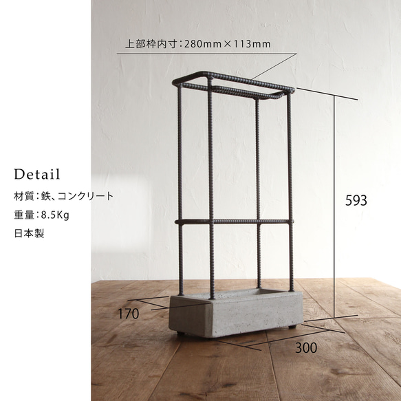 ◆ 商品名 コンクリートと鉄筋の傘立て ◆ 商品説明 鉄筋と成形したコンクリートを組み合わせて作ったシンプルな傘立てです。 鉄筋部分は粉体焼き付け塗装を施したあと、エージング加工をしていますので、 黒の単色塗りつぶしではなく、鉄筋の素材感がある風合いに仕上げています。 ベースは型に流し込んだコンクリートを乾燥後取り出し、表面には薄くクリアー コートを施しています。コンクリートのベースは重みがあり安定しているので 少々の風では倒れることはありません。折り畳み傘を引っかけることができる フックが上部についています。 全ての工程を自社工房で製作している日本製のハンドメイド商品です。 ◆ 仕様 ・サイズ : 幅 300 奥行 170 高さ 593 : 重量: 約 8.5 Kg ・材質 : 鉄(粉体焼付塗装) コンクリート ・生産国 : 日本 ◆ 備考 ※掲載画像の色合い等には十分配慮しておりますが、撮影時の光の反射具合などにより 色に違いがでることがあります。 また、ブラウザ上では商品のお色を忠実に表現できませんことを予めご了承下さい。 ※商品は傘立て x 1点です。使用備品やその他の商品はイメージです。 ※ギフト包装はお受けできません。 |