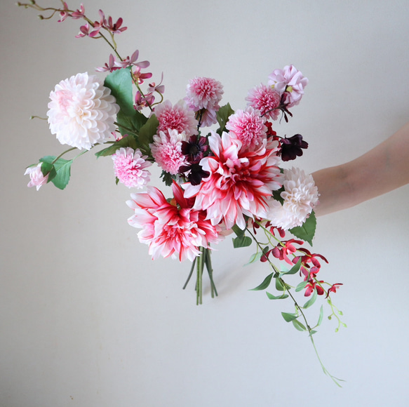 トレンドの洋マム&ダリアや雰囲気のあるチョコレートコスモスなどの人気花材を動きを出して流れるよう