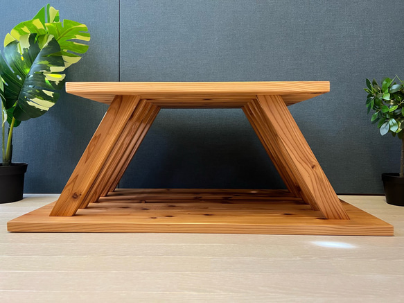 栄町工房です。 ご覧頂き誠に有難う御座います。 ◎荒々しい木目が特徴の、杉材を使用したローテーブルです。 ◎天板と底板の間は収納スペースとしてご活用頂けます。 ◎上下の支えに角度をつけた材料を用い、お洒落な造りとしました。 ◎上下を反転する事により、様々なアレンジが可能です。 ◎格子状の支え脚の間には、本を立て掛ける事ができます。 ◎中間のスペースは高さ30cmで、A4サイズのマガジンが入る様にしました。 ◎和モダンをイメージして作りました。 ◎ビス穴は埋木処理を施しております。 ◎世界に一つしかない木目、如何でしょうか? 【寸法】 横幅90cm、奥行45cm、高さ35cm 【仕上げ】 ウレタンコーティング 【納期】 10〜14日間程度 【商品の注意点等】 ・ウレタンコーティングは耐光性・耐水性に優れておりますが、水に濡れた場合は早めに水気をお拭き取り下さい。 ・木目は素材によりまちまちとなりますが、逸品モノとしてご了承ください。 ・寸法に関しましては多少の誤差が生じる場合が御座います。 ・金物類の仕様が変更になる場合が御座います。 ・稀に塗装ムラや垂れ跡が残る場合が御座います。 ・天然素材を使用しておりますので、傷や欠けや節穴、凹み等が残る場合が御座います。 【ウォールシェルフのお取付け】 ・お取付けの際は壁の下地を狙ったビス打ち固定をお勧め致します。 ・ハンガーが壁下地と合わない場合は、ハンガーの位置をご調整下さい。 ・取付用ネジは付属致しません。 ・木材と木材との間に隙間が出てしまう場合が御座います。 ・木材の歪み等で壁面に全ての面が接地しない場合が御座います。 【変更オーダーについて】 ・規格の都合でご希望に添えない場合も御座いますが、極力お客様のご要望に叶う様にご対応致します。 ・サイズ変更、高さ変更、色替え、脚の仕様変更などのご要望が御座いましたらお気軽にお問合せ下さい。 ・完全オーダーメイドも承っております。 【お知らせ】 ・私たちは素材本来の美しさを活かした家具造りを心掛けております。 ・取扱商品のお値段は全て送料込みとなっております。 ・当工房はお気軽な家具屋を目指しておりますので、ご質問等御座いましたらお気軽にご連絡下さい。 ・是非ホームページにもお越し下さい。 ・あまり更新してませんがインスタもやってます。