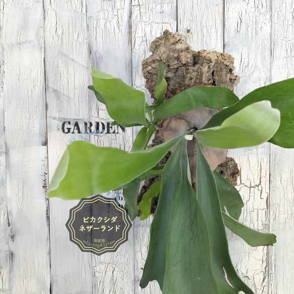 商品コード:B-000217 ・素材:コルク ・写真現品となります。 ・コルクの 高さ約30cm 横幅約15cm 【魅力】 こうもりが羽を広げた様な葉の形が印象的な着生シダです。和名の「ビカクシダ」は、鹿角(びかく)と言う様に、葉の形状が鹿の角に似ていることから名づけられました。エキゾチックな観葉植物としてお楽しみください。 ・耐寒性:★★★☆☆ ・耐暑性:★★★★★ ・耐陰性:★★★★☆ 【育て方】 ・置き場所:耐陰性があるので日陰でも大丈夫ですが、日光が当たった方が健康な株になるので、なるべく明るい場所に置いてください。また、風通しがとても重要ですので窓辺で風を感じさせてください。 直射日光を当ててしまうと、刺激が強すぎて葉焼けを起こしてしまうので、30%~50%の遮光をしてください。真夏はレース越しのカーテンぐらいがちょうどいいです。 ・水やり:土ではなくベラボン/水苔です。水やりは毎日ではなく、ベラボンが乾いたら湿るまで与えてください。やりかた例:桶等に水をためてベラボン部分を浸透させてください、10程度で浸透します。 ・肥料:1~2ヵ月に一度液肥を与えてください。 ※○○に置きたいけど大丈夫?などなんでもご質問ください。 【留意事項】 ・丁寧な包装を心掛けておりますが、配送により土が溢れや葉落ちが発生する場合もございます。 ・梱包は中古の段ボールを使用させていただきます。 ・写真現品となりますが、日々成長しておりますので、形状は変化しております。 #観葉植物 #ビカクシダ |