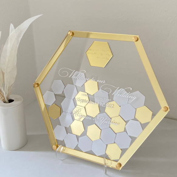 サイズ 横幅30センチ 素材 アクリル等 チップカラー グレーホワイト、ゴールド(色指定可能) セット内容 裏面用アクリル、挟み込み用ゴールド枠、彫刻表面用アクリル ヘキサゴンチップ色ミックス20枚(予備数枚)、組みネジ6セット、スタンド用パーツ、ゴールドプレート封用パーツ 組み立ててお届けします。 ※画像①枚目は30名様用です。 商品代金は20名様用ですのでご注意下さい。 20名様は画像よりチップを大きくしてご用意いたします。 ご購入後にメッセージにて、ゴールドプレート、表面アクリル板の彫刻内容をご連絡下さい。 ドロップチップへの名入れも承ります。 1枚100円 |