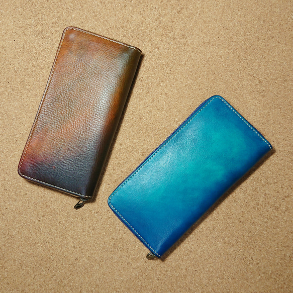 受注製作です。 注文状況によりますが、現在の納期は約2週間となります。 オプションで基本となる色を選択してください。 そこから、ぼかしグラデーション染色します。 (黒はグラデーションできませんので、単色になります) 基本的に内装の変更はできませんが、希望される方は追加料金でオーダーメイド対応いたします。メッセージにてご連絡下さい。 お客様と色の認識違いなどを無くすために、メッセージで写真を使って頻繁にやり取りをしたいと思いますので、よろしくお願い致します。 【商品説明】 定番デザインのラウンドファスナーの長財布です。 国産の高級本革を手染め&手縫い(一部ミシン縫い)で仕立てています。 外装は時間をかけて何層にも染色を重ねるので、とても深みのある色合いになります。 また、片側を濃く染めてぼかしグラデーションで染色します。 手染めなので、二つと同じものは作れません。なので世界にひとつだけの財布となります。 人と違ったものが持ちたい方、大切な方へのプレゼント等…いかがでしょうか? 【収納について】 内装の中央に小銭入れがあり、カード入れが両側合わせて8ポケット。1ヶ所に2枚ずつ入るので計16枚ほど入ります。 カードの後ろにフリーポケットがありますので、お札やレシートなど入ります。 【サイズ】 ■縦10×横20×厚み2(㎝) 【素材】 ■ヌメ革(国産) ■アンティーク調ファスナー金具 【注意点】 ■すべて手作業で製作している為、小キズがある場合があります。 ■無理に多くのものを入れると革が伸び型崩れを起こします。 ■お使いのモニターによって色味が実物と違って見える場合があります。 ■天然の牛革ですので、生きているときについた体の傷などある場合があります。 ■天然素材に対して理解のある方からのご購入をお待ちしています。 不明な点は遠慮なくお尋ねください。 革 皮 本革 ヌメ革 レザー 手縫い 手染め コインケース 小銭入れ ラウンド ファスナー ジップ アンティーク ヴィンテージ ブラウン 茶 ブルー 青 ロング ウォレット 長財布 財布