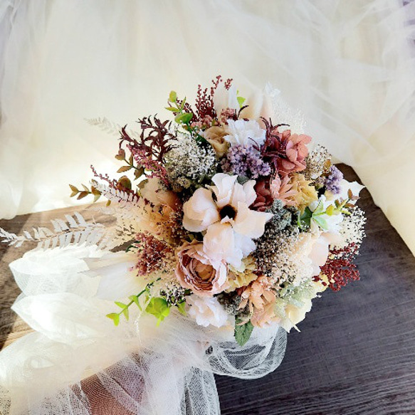 creema出品作品 ライラの花音 こちらは受注にてオーダー対応させて頂きます。基本的に全て一点物です。こちらとはデザインはかわりますことご理解ください。 同じような雰囲気で、よりドレスにあうようにオーダーにて打ち合わせをしながら作成致します。 ♡クラッチブーケ 20~22㎝前後(単品の価格) アーティフィシャルフラワー+プリザーブドフラワー(一部ドライフラワー) ☆ブートニア、ヘッドパーツ等、他のアイテムは別途価格にて承ります。 価格はオプションを参考にしてくださいね ⭐全文をお読み頂き「質問する」をタップしてお問い合わせください。 お急ぎの方もご相談に応じます。 ♡オーダーの流れ♡ 全て打ち合わせさせていただきます。 ドレスのお写真やその他必要なお写真を拝見→ご希望のお色や画像をお訊きし、基本的な花材①②③や土台、サイズをきめる。 ベースや細かいデザインはドレスにあったイメージでお任せ作成させて頂きます。 ご要望はおっしゃってくださいね 大切な一日を最高に素敵な日になるような、お手伝いが出来たら嬉しく思います。 お二人の今までの歩みの想いを永遠と幸運のリースブーケに。 ♡ウエディングセット例♡ オーダー承りますページから価格をご確認ください ◎ウェディング三点セット◎ リースブーケ&ブートニア&ヘッドドレス 約34-38㎝前後or27㎝~30㎝前後 ブートニア ヘッドパーツ、15パーツ以上 ◎二点セット◎ リースブーケ&ブートニア クラッチブーケ、バスケットブーケで変更可能 花冠やリストレットブーケも+料金で可能 ◎ご両親贈呈用◎ 22-24㎝リース×2 17-19㎝リース×2 お花アルミフォトフレーム×2 お花アルミフォトフレーム×2 お花ボリュームアップ ◎ウェディングクリーマお得5点セット◎ リースブーケ 30~35㎝ ブートニア ヘッドドレス ご両親様の贈呈用リース 22㎝ 価格は「オーダー承ります」に詳細あります。 ☆基本的な花材種類☆ ①アーティフィシャルフラワー+プリザーブドフラワー ②プリザーブドフラワーメイン+ドライフラワー+アーティフィシャルフラワー ローズ増量→プラス料金 ③アーティフィシャルフラワーのみ また、リストレットブーケ、花冠、ブライズメイド用ブーケ、リースブーケと同じデザインのウェルカムリースやご両親への贈呈用リース、引き出物のミニリース作成などオーダー可能です。 撮影服飾雑貨小物はつきません。 注意事項やプロフィール等もご一読よろしくお願いいたします。