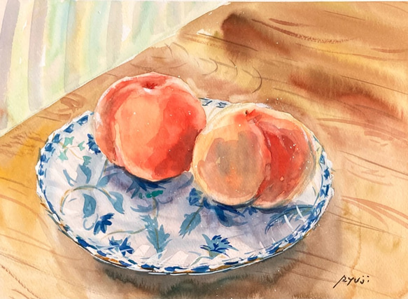 先程購入した桃を描きました。 今も甘い香りが部屋に漂っています。 桃のみずみずしさと季節感が 伝われば嬉しいです。 ~展示中の作品も沢山ございます。宜しければご覧下さい。~ ※WHITE WATOSON紙 F4:242 ×332mm ※原画1点限りです ※額装してお送りします。 (額装は無料で当方で準備します。) ※直射日光の当たらないところに掛けて下さい。 ※その他、ご不明なことは何でもお問い合せ下さい。 |