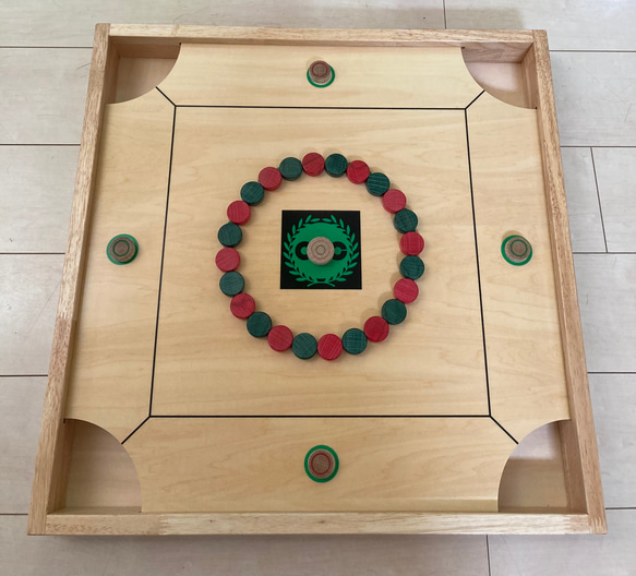 主に滋賀県彦根市を中心に明治の頃から遊ばれているボードゲーム【カロム】です。 こちらはCFC(カロムファンクラブ)公認盤になります。 おはじきとビリヤードを合わせたようなゲームで2人対戦(シングルス)4人対戦(ダブルス)が可能です。 カロム玉(ストライカー4個・パック24個・ジャック1個)セット治具、説明書付き 寸法: 62cm×62cm×6cm |
