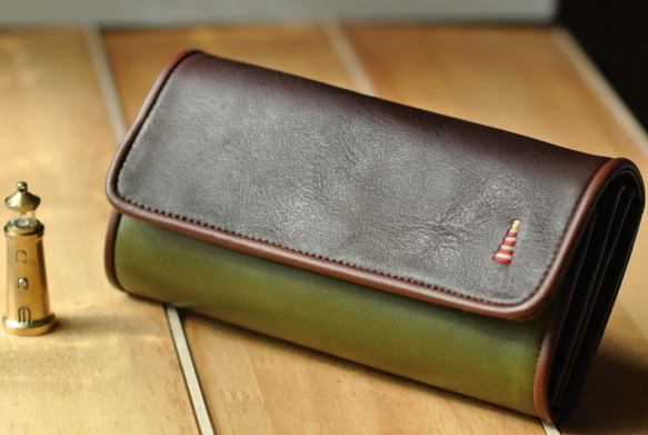こちらのお財布は受注製作となります。 納期はご購入から1ヶ月半〜2ヶ月程度です。 詳しくはご連絡させていただきます。 オプションや色見本のページを製作しています。 販売ページの展示タブをクリックしていただいてご覧ください。 漁師の嫁財布 カーキ×こげ茶 です。 主婦層の意見を取り入れた、大容量でとても使いやすいお財布です。 当工房で一番販売数が多いお財布で、男女問わず熱いご支持をいただいております。 ワンポイントで灯台の刺繍がついています。 縁周りは、くるみ玉という手法で仕上げています。 大変手間のかかる手法ですが、強度アップと見た目がとてもチャーミングになります。 革は栃木レザーを使用していますので、経年変化が味わえ 使用する毎に、革が深い色合いに変化していきます。 もともと厚みがある作りなので、結構な容量を入れられても、財布太りしにくいです。 サイズ(ミリ) 縦195 × 横110 × 厚み50 素材 牛革 栃木レザー、イタリア製バケッタレザー 牛革 コンビなめし 生地 帆布 本体とフタはマグネットで着脱します。 マグネットとカードポケットを出来るだけ遠ざけた配置にしていますので、磁気に当てることによるカード不良を防止します。 カードポケットはグラデーションを付けて色を変えています。 お持ちのカードに合うお気に入りのポジションを見つけてください。 小銭入れ部分は大きく開き中身が見やすい作りです。 容量が大きなポケットが二室あるので、たっぷり収納できます。 また、ポケットの開け閉めで力のかかる部分には、革で補強してあります。 せっかくなので、色革を使いワンポイントにしてあります。 カードポケットは12室あり、同じ方向を向いていますので、ぱっと見て判別できます。 マチがあるので、お札も沢山収納できます。 後方のカード入れとフタ部分の間にもポケットがあるので、チケットやへそくりも入ります。 お財布の背面には何かと便利な外ポケットが付いています。 レシート類の収納にも向いています。 中の生地は全て帆布を使用していますので、通気性がよく長期間の使用でもねちゃねちゃ引っ付いたりはしません。