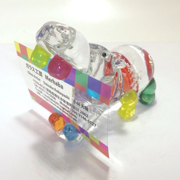 あんぐり開いた口に、名刺やショップカードをくわえてくれる、可愛いカバの名刺ホルダーです。 首のシワ、小さな耳、ちょろっと付いたシッポ。 どこから見ても愛らしいカバのオブジェです。 ソリッドワークと呼ばれるガラスの技法を用いて制作しています。 ソーダガラス・色ガラスパウダー・色ガラスロッド 高さ9㎝ 横12㎝ 美しい夏ハンドメイド2016 |