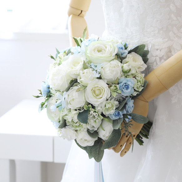ホワイトとライトブルーのローズ・ラナンキュラスに 細葉ユーカリを合わせた クラッチブーケとブートニアのセットです。 ブートニアには ブートニアピン・キャップをお付けしています。 リボンにはほつれ防止処理を施しております。 軽くて丈夫なアーティフィシャルフラワーのブーケなので、 持ち運びがしやすく、 結婚式・前撮り写真・二次会・リゾート婚・ 海外挙式などにもおすすめです。 挙式の後は花瓶にさして お部屋のインテリアとしても飾っていただけます。 「サイズ」 ブーケ直径約25cm ブートニア幅約12cm×長さ約15cm 「使用花材」 アーティフィシャルフラワー ローズ ラナンキュラス スノーボール ブルースター ユーカリなど サテンリボン 「ラッピングについて」 特にご希望がなければ、ブーケボックスでお届けいたします。 ブーケケース(幅30cm×奥行20cm×長さ53cm)・ ブーケバッグ(幅30cm×長さ79cm)・ 持ち歩き用花袋(幅42cm×奥行29cm×長さ36cm) などをご希望の方は 別途オプションからご注文をお願いいたします。 ブーケをブーケケースに入れて持ち歩かれる際には、 ブーケバッグに入れられることをおすすめします。 ブーケのみを持ち歩かれる際は、 持ち歩き用花袋に入れられることをおすすめします。 「配送について」 クロネコヤマトでのお届けとなります。 日時指定も可能です。 ご希望の場合は、備考欄にお書き添えください。 「メッセージカードについて」 メッセージカードをお付けすることもできます。 ご希望の場合は、 メッセージに入れる内容・お名前などをご明記のうえ、 備考欄にメッセージ内容をお書き添えください。 「アーティフィシャルフラワーの取り扱いについて」 アーティフィシャルフラワーは、 生花をリアルに再現し、 生花にはない美しさを表現して作られたお花です。 ポリエステルなどで作られているため、 ほとんど劣化することがなく、 長時間お楽しみいただけます。 水やりは不要です。 破損の原因となりますので、 お花やグリーンに強く触れたり、 引っ張ったりしないようにお願いいたします。 アーティフィシャルフラワーは「造られたお花」ですが、 1輪1輪のお花の形や表情が微妙に違うことがあります。 ひとつひとつ手作りをしておりますので、 同じ花材を使用していても、 サイズ感や雰囲気が少しずつ変わってくることもあります。 多少の違いは、 それぞれの作品の個性ととらえていただけると幸いです。 「アーティフィシャルフラワーの取扱説明書について」 アーティフィシャルフラワーの取扱説明を記載したカードを、 同封させていただきます。 アーティフィシャルフラワーをご存じない方・初めての方でも、 安心してご注文いただけます。 「返品・交換について」 発送には万全を期しておりますが、 万が一、 配送中の事故によると思われる破損があった場合は、 対応をさせていただきます。 商品到着後3日以内に、商品写真を添付の上、 メールにてご連絡をお願いいたします。 期間を過ぎますと、交換の対応ができなくなります。 あらかじめご了承ください。 お客様のご都合による返品の場合には、 ご返送時の送料につきましては お客さまのご負担をお願いいたします。 実物に近い状態で商品の撮影ができるように努めておりますが、 お使いのパソコンやブラウザによって、 色の見え方に若干の違いが生じる場合があります。 お客様のご都合やイメージ・色味の違いでの 返品・交換はお受けできない場合がございますので、予めご了承ください。