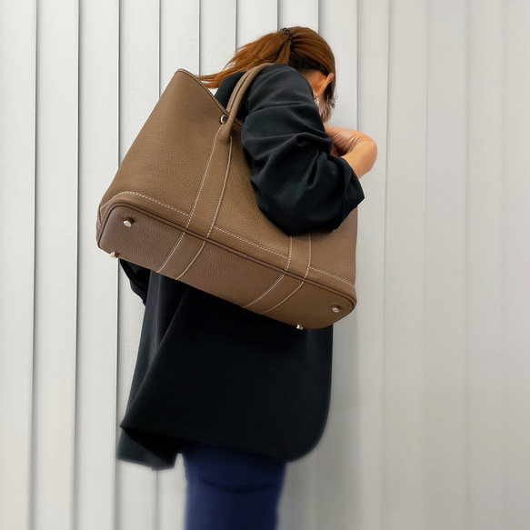 人気カラーのブラウングレーが販売です 安心感ある人気の牛革製トートバッグに以前大変好評いただきましたLサイズが数量限定で復活です。 物を出し入れしやすいシンプルなデザインで扱いやすさは抜群です。通勤や通学などのスタイルにもぴったり! もちろん!普段使いにも大人カジュアルにお使いいただけます。 荷物の多い方にも嬉しい収納力。 軽い一泊くらいならいけそうです(^^) 丈夫で高級感ある牛革素材を使用しています☆ 内側大きめのファスナーポケット付き 内側の生地と同素材のファスナー付きポーチもお付けします。 ※こちらのLサイズはショルダー無しです※ 【サイズ】 W35(ボタンを外して横長の時46センチ) ×H26×D17 センチ ハンドル高さ 15センチ 【重量】バッグ本体 約950g 【付属品】布製ポーチ 【本体価格】¥17,000-+tax ※チャームは別売りです