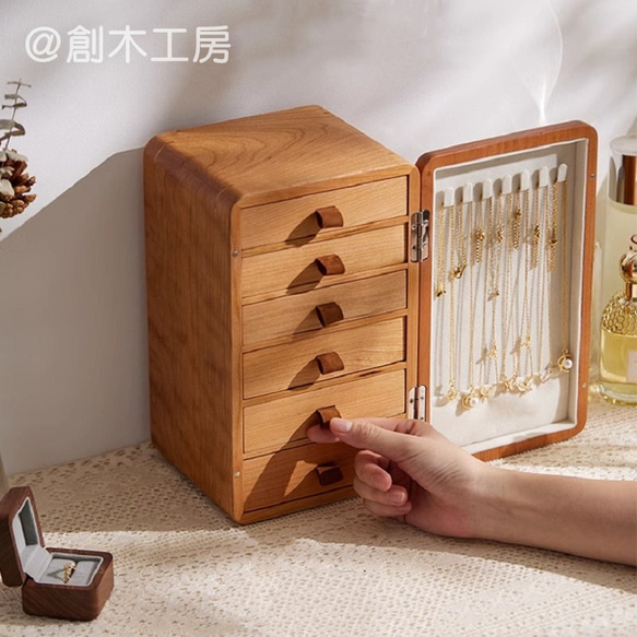 【制作者】初心 【当店は初心から委託されて代理販売を行なっています】 ◆作品説明◆ 大変ご好評頂いている当店のアクセサリー収納シリーズの最新作になります。 お気に入りのジュエリーをおしゃれに整理して収納できます。 またお部屋のインテリアとして飾っておいてもいいかもしれませんね♡ 日頃のご愛顧に感謝を込めてご用意した特別なコレクション。 ご自分へのご褒美や大切な方へのギフトとしても最適です。 無垢材を使用したアンティークな引出しタイプのジュエリー収納ボックス。 木材で作った温かみのあるアクセサリー収納が完成しました。 ベロアタイプのアクセサリートレイ5個付きで、五段共に収納になっておりますので、イヤリングやピアス、指輪やネックレス、ブレスレット、時計等を可愛く収納出来ます。 材質:無垢材(チェリー材/ウォールナット材)、ベロア、真鍮(チャーム) 仕上げ:天然オイル (五段)Sサイズ:幅13.2×奥行15.5×高さ21.6cm 重さ:1.46kg (六段)Mサイズ:幅16×奥行17.5×高さ26.8cm 重さ: 2.56kg (七段)Lサイズ:幅19×奥行22.2×高さ32cm 重さ:4.5kg ★自然素材を使った塗料ですので、安心してご使用頂けます。 ◆ご注文につきまして◆ *作品は落札後の制作になりますので、約1週間程お時間をいただくことになります。 *宅配は佐川急便でします。 運送会社:佐川急便 配送状況確認用URL: *返品は原則としてお受け出来かねますが、当方のミスによる誤送、破損などのトラブルに関しましては誠意を持って対応させて頂きますので、評価前にお問い合わせ下さい。 #母の日ギフト #ハンドメイド #Creema限定 #母の日早割 #短納期 #再販 #木製品 #チェスト #引き出し収納 #ヴィンテージ #家具収納 #インテリア収納 #女性 #出産祝い #記念日 #プレゼント |