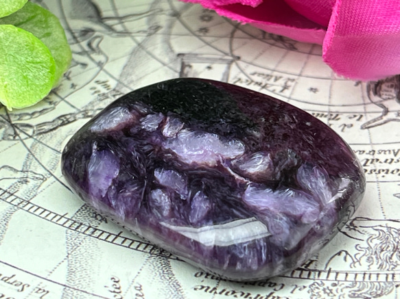 ライトを当てる角度によってシラーが煌めき、陰と陽が入り混じるような美しいチャロアライトのタンブルです✿*:・ 瞑想やグラウンディングなどに適していると思います(*´꒳`*) 自然光のお写真とサイズは画像7枚目になります(❁ᴗ͈ˬᴗ͈)。:.✿*:・ ✡️チャロアイト ラリマー、スギライトに並んで世界三大ヒーリングストーンのひとつに数えられます。 ロシア連邦サハ共和国のチャロ川流域にあるムルン山塊のみでしか産出されず、チャロアイトの名はこのチャロ川流域が語源になったという説とロシア語の「魅惑する」という意味を持つcharoから名付けられたという二つの説があるようです。 紫色の地色に白や黒のマーブル模様が特徴で、結晶繊維の構成によっては稀にキャッツアイ効果が現れるものもあります。 ✡️チャロアライトの効果 ◯魅惑 ◯癒し ◯浄化 ◯保護 ◯ 精神的疲労回復 瞑想やヨガにいかがでしょうか❁⃘*.゜ ※本体以外のディスプレイは含みません ※ 天然石のため細かいキズや欠け、へこみやひび割れなどが 見られる場合があります。 ⚠︎撮影時の照明やお使いのディバイス環境により、実物と色調が異なる場合がございます。